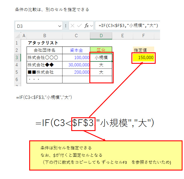 ◇ 指定値(セルF3 ) より小さいと "小規模" と表示したい