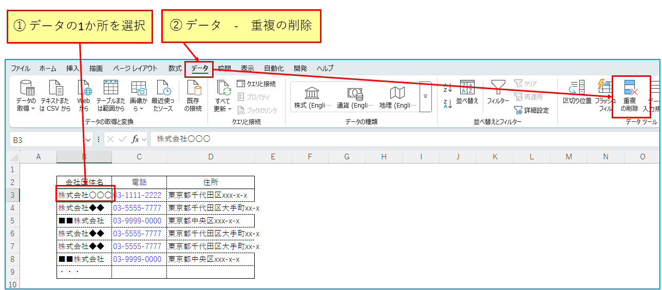 そのような時に、簡単に重複データを削除する方法をご紹介します