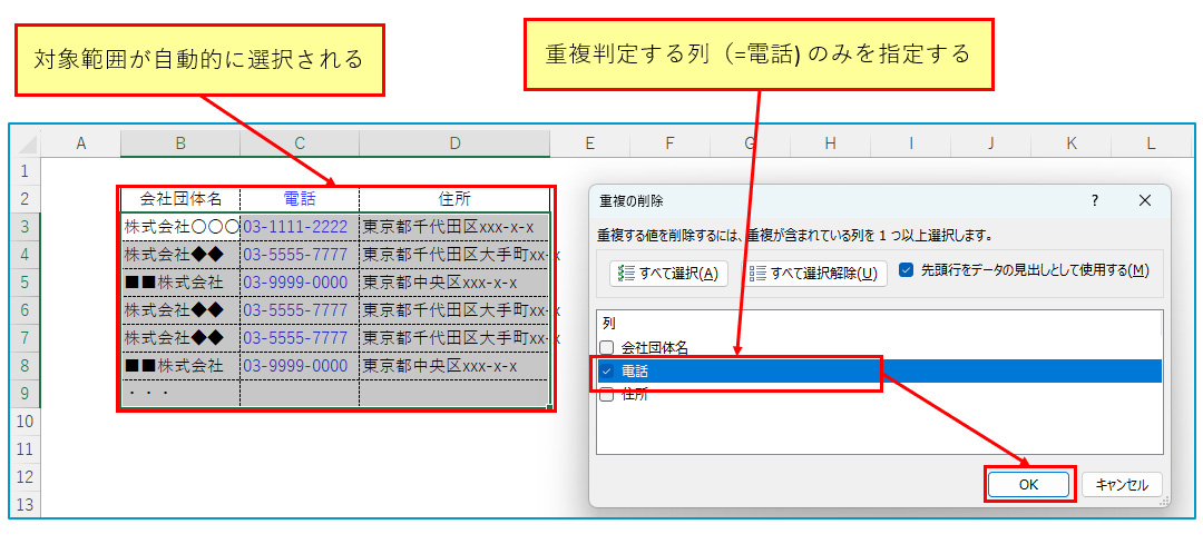 ◇ 保有しているアタックリストについて電話番号をキーに重複データを削除する