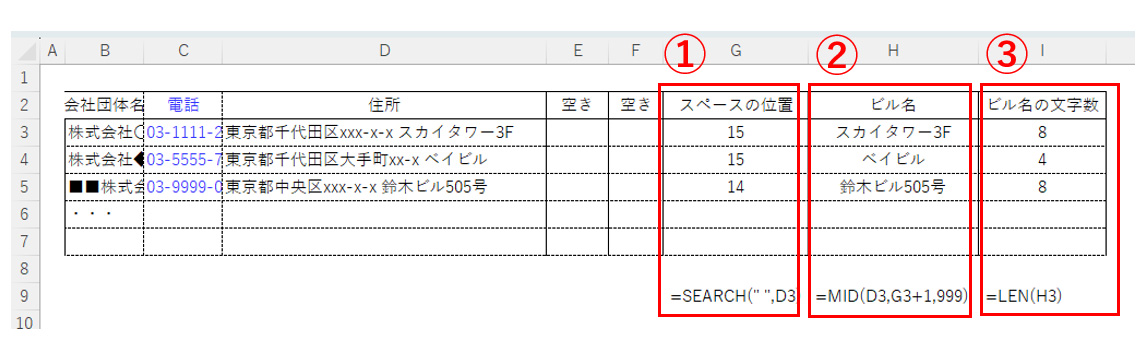 ③ ビル名の文字数を調べる