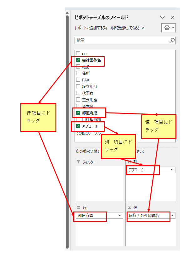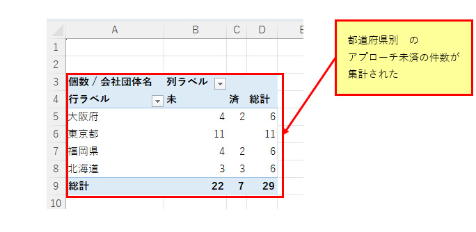 ◇ クロス集計 : 都道府県別に アプローチ未済 の件数を集計したい